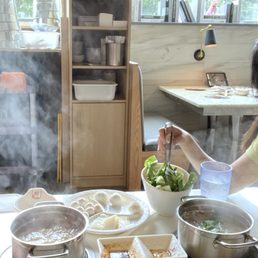 YES I AM A FAN !!! So many choices of hotpot soup base, lots of variety of raw food to cook in your pot! I mean this place is a small little heaven for mini pots! You don't need to have the same soup base with your friends and if you all love to share you can order 4 different soup base pots and trade them. There is also a small condiment table and they literally have everything you need for the parings ! The conveyor belt is used for some random instant noodles and veggies that you can grab and put inside your pot. It's just such a cool and cute experiences ~ robots deliver your food from time to time or the waiters will bring them over. Adorable concept! Great environment! And priced reasonable. What else can you ask for? It's so convenient and a little something for everyone who loves hot pot on their own way. Definitely be back:) going to check out the one in mosiac bc I lived my experience so much